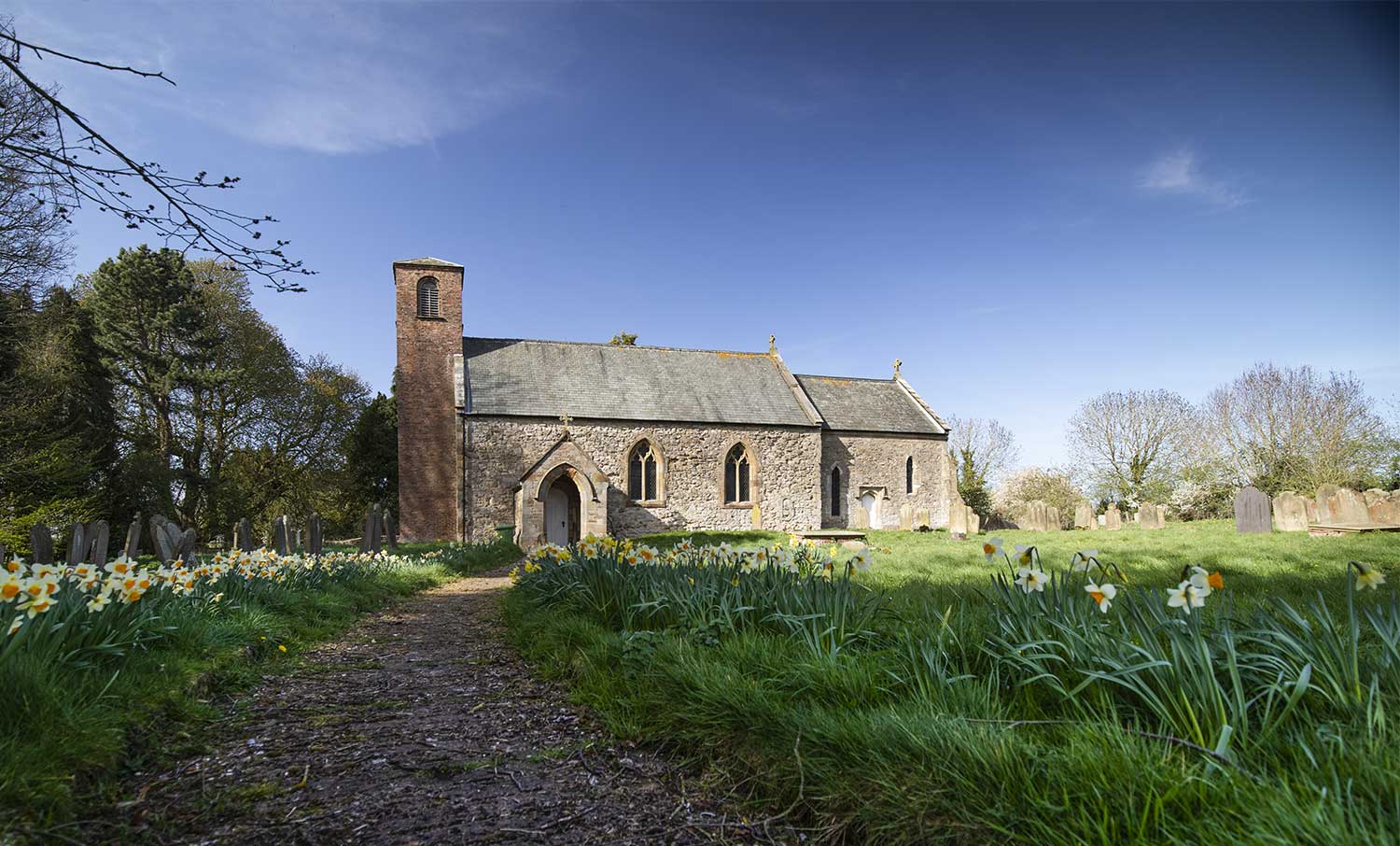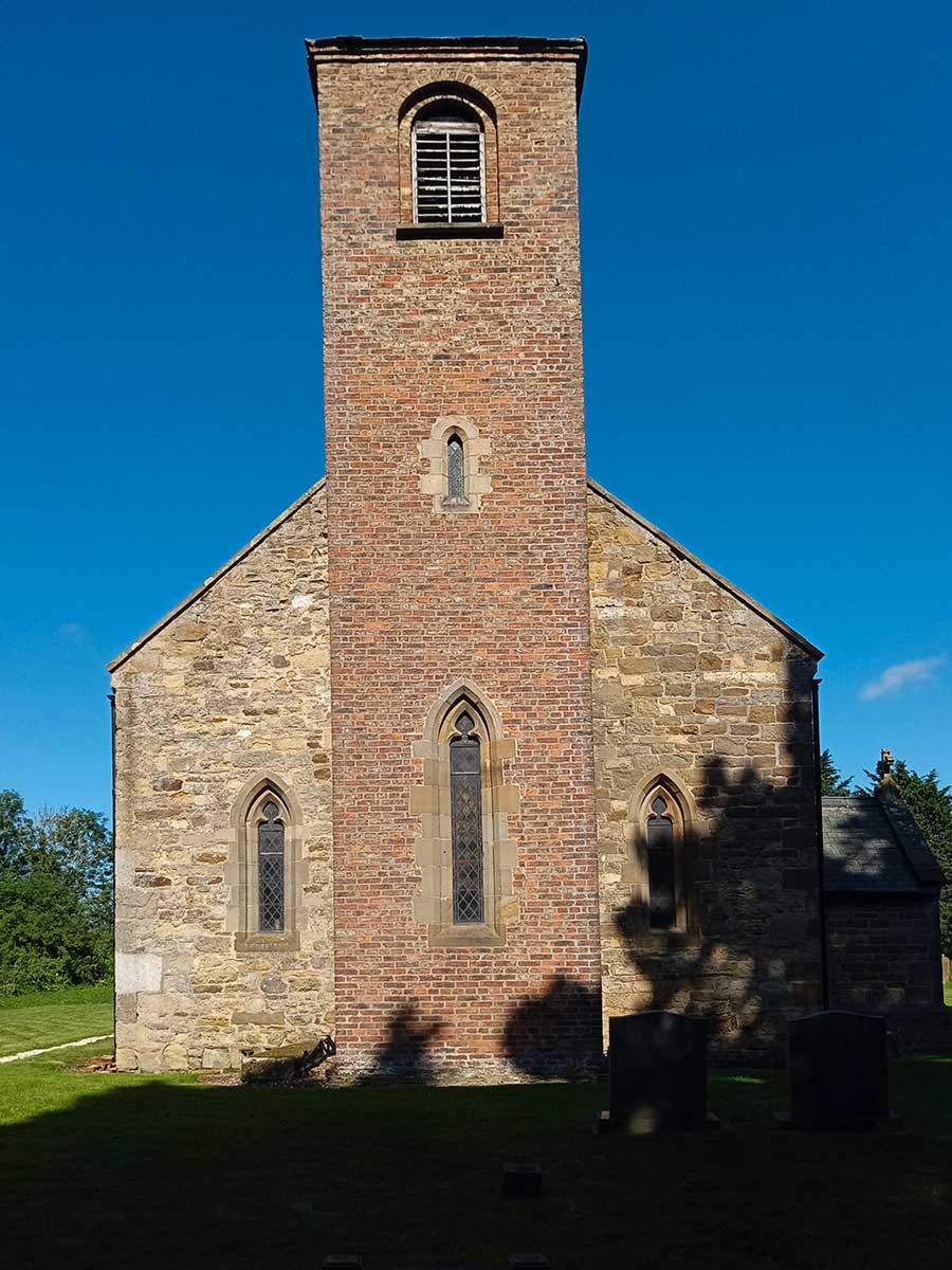 St. Mary’s Church, Skirpenbeck, showing the eighteenth-century brick tower and the twelth-century nave walls with slit windows.