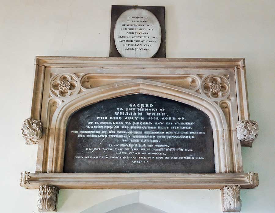 There is a memorial on the north wall of the nave to William Ware. The Ware family have been connected with Skirpenbeck for generations. There are many gravestones in the churchyard bearing their name.
