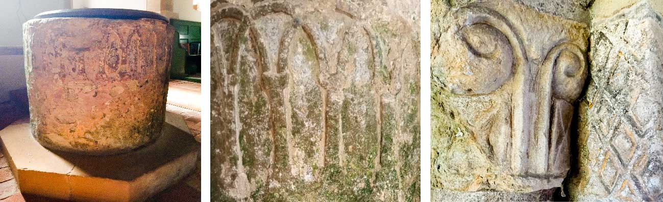 The twelfth-century tub font with, centre, details of the carving. On the left is a detail from the South Door.