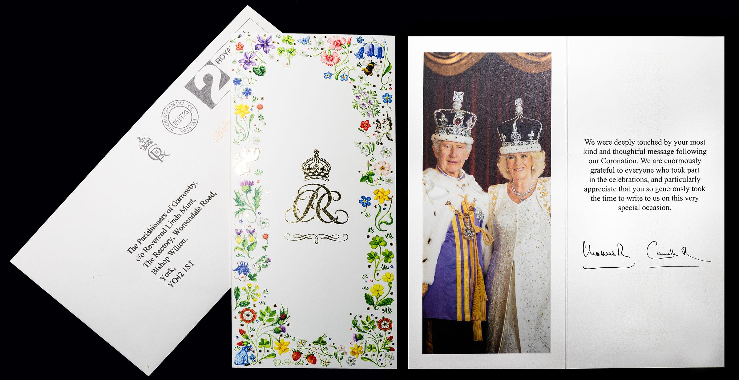Also, I was delighted to receive the card displayed, addressed to everyone in Garrowby following the King and Queen’s receipt of the card we sent on the occasion of the Coronation. The card had photographs of all the churches and congratulations from all the parishioners.