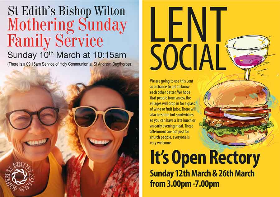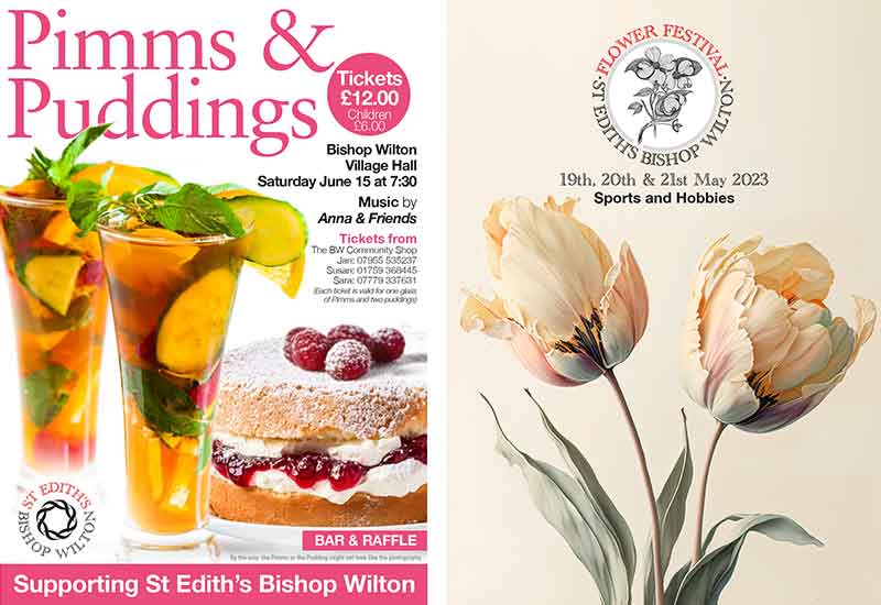Posters advertising two major events. Pimms and Pudding was the main fundraiser for 2024. Held in Bishop Wilton Hall, and featuring entertainment by a local band, it was an enjoyable occasion.
