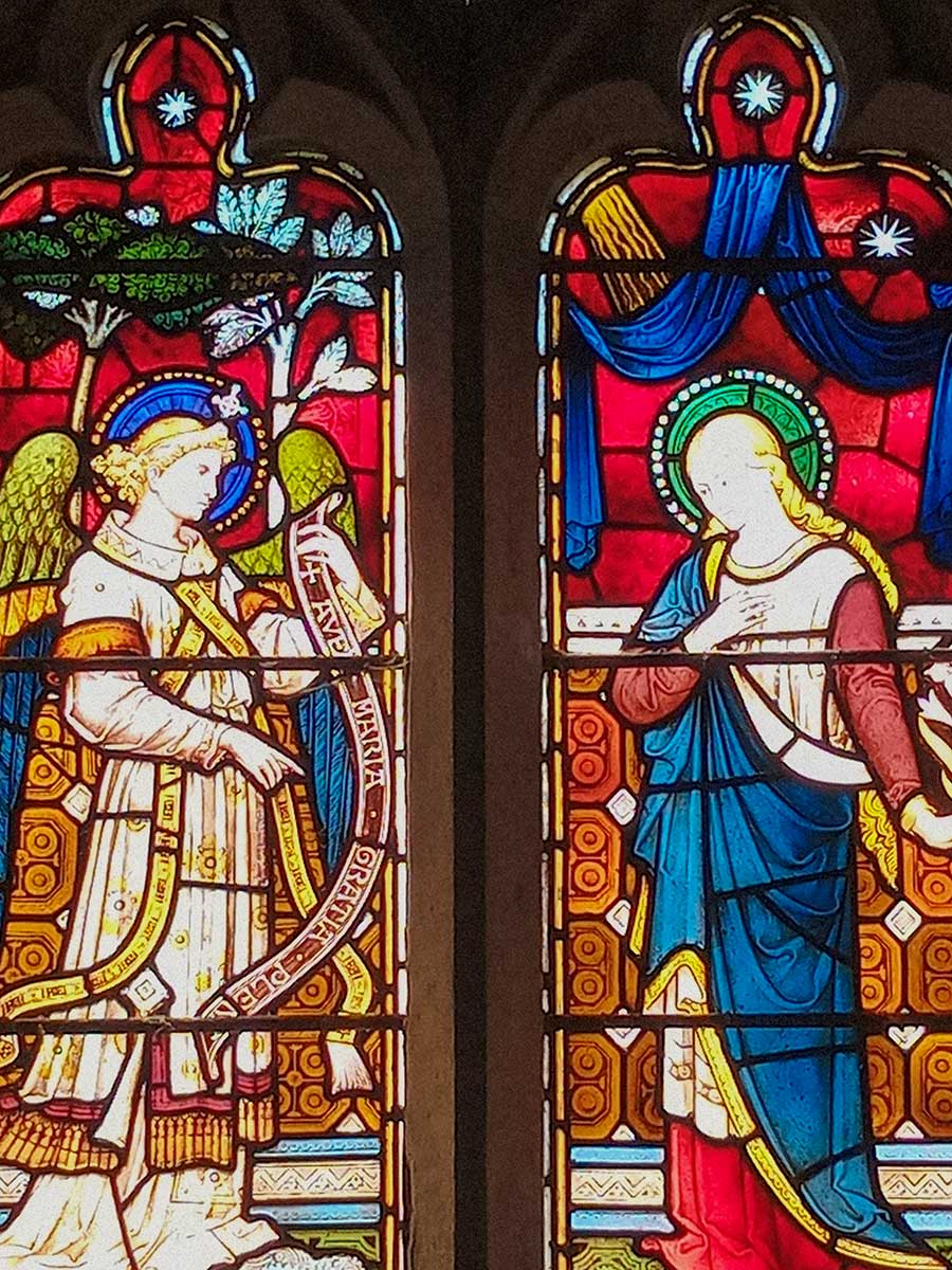 There is another memorial window in the chancel at Full Sutton in memory of Ramsey Garwood and his wife Hannah. Another fine example of Victorian craftsmanship, this window depicts the Annunciation. Ramsey Garwood was a son of Edmund Garwood, vicar of Hessle. He farmed at the Manor House in Full Sutton. There are gravestones to Ramsey and Hannah Garwood in the churchyard at Full Sutton.